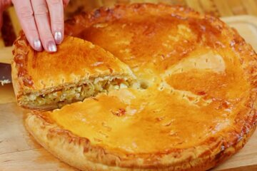 Розігрійте духовку до 180°C і випікайте пиріг 35 хвилин до золотистого кольору і твердості.